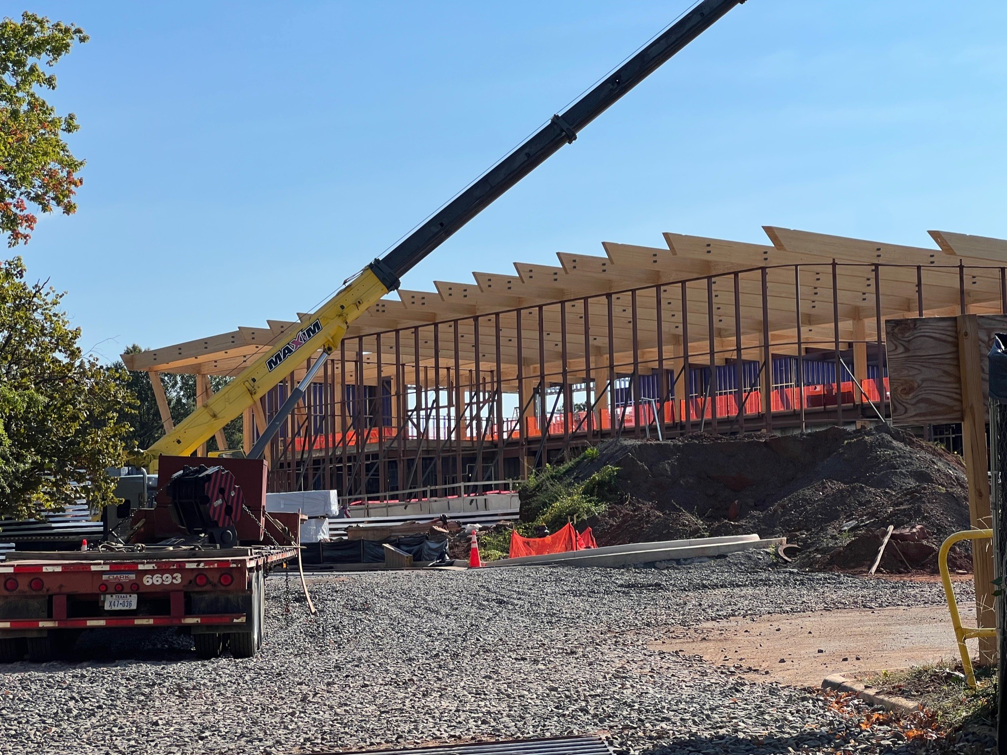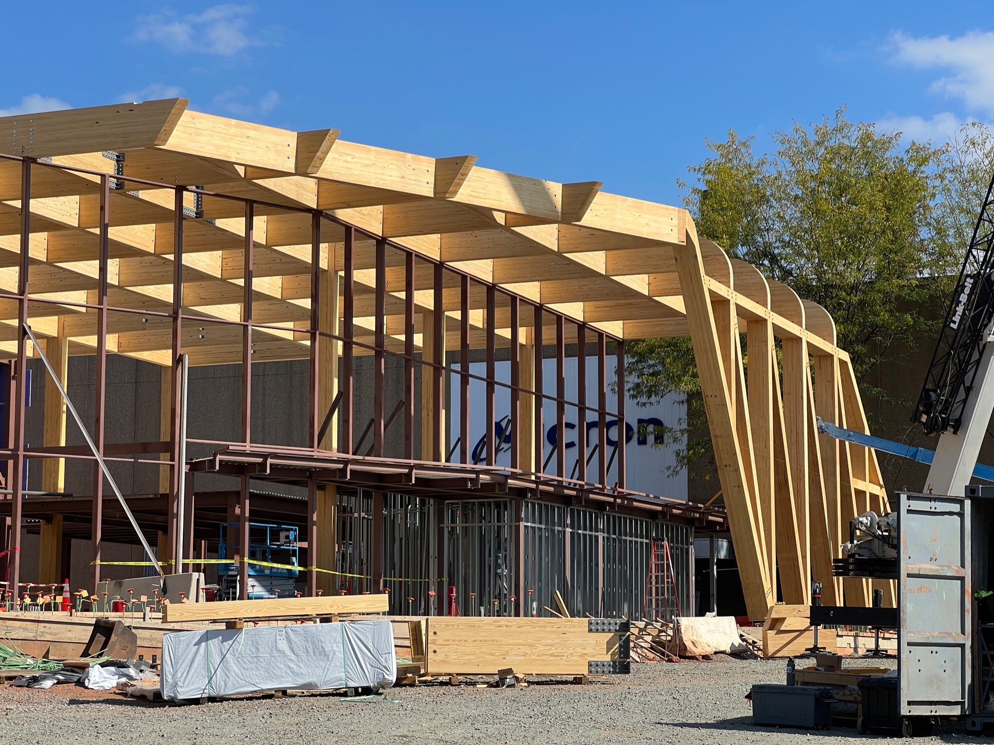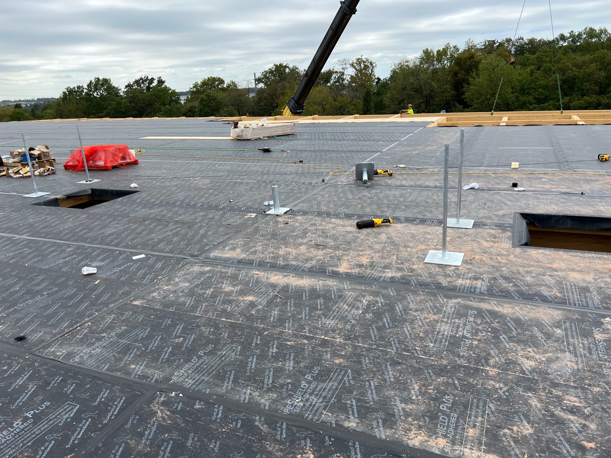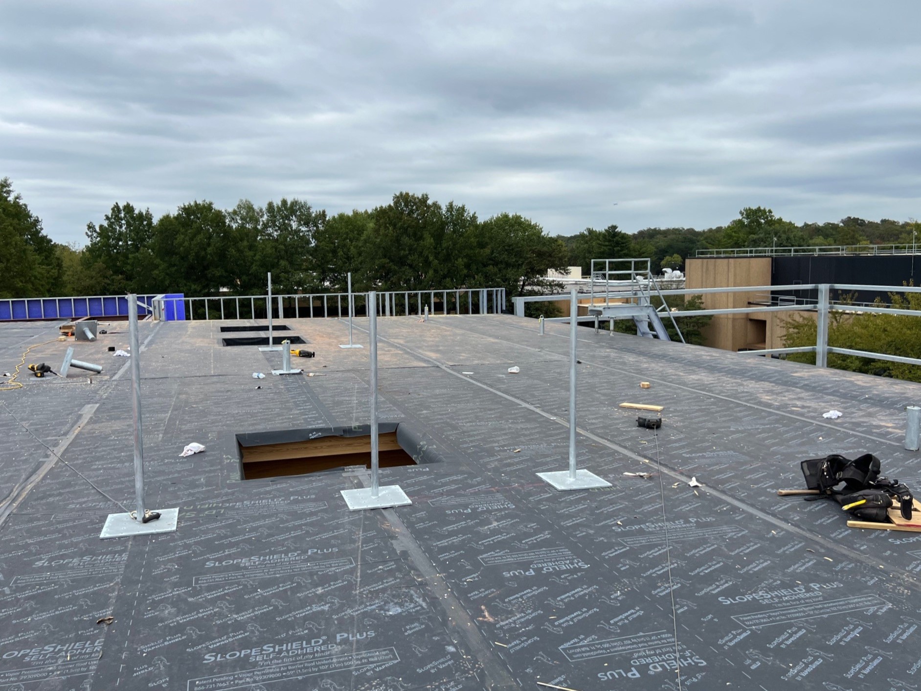 As part of Micron’s expansion at its Manassas, VA plant, the new mass timber building is constructed out of glulam posts and beams, as well as glulam branches around the perimeter. Protecting the expansive mass timber roof from moisture infiltration is over 60,000 sq.ft. of VaproShield’s SlopeShield Plus SA air barrier and permeable vapor retarder membrane. SlopeShield Plus SA protects the mass timber from bulk water intrusion and concurrently dries mass timber through moisture vapor diffusion. Once the mass timber dries, it will not get wetter and the mass timber deck is protected from future rain events. SlopeShield Plus SA is extremely durable to foot traffic and heavy equipment, it can withstand 180 days of UV and climate exposure, helping contractors stay on schedule despite inclement weather events.