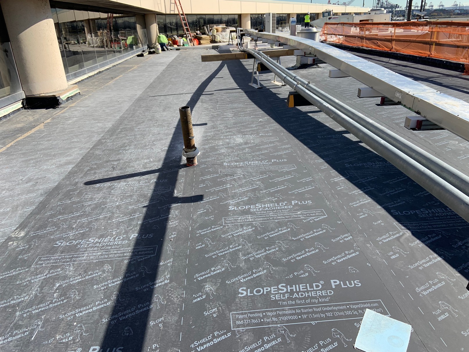 Over 375,000 sq.ft. of SlopeShield Plus Self-Adhered was installed on a low slope roof over a combination of new and existing gypsum recovery board at the Newark Liberty International Airport, Terminal C Roof Replacement project.