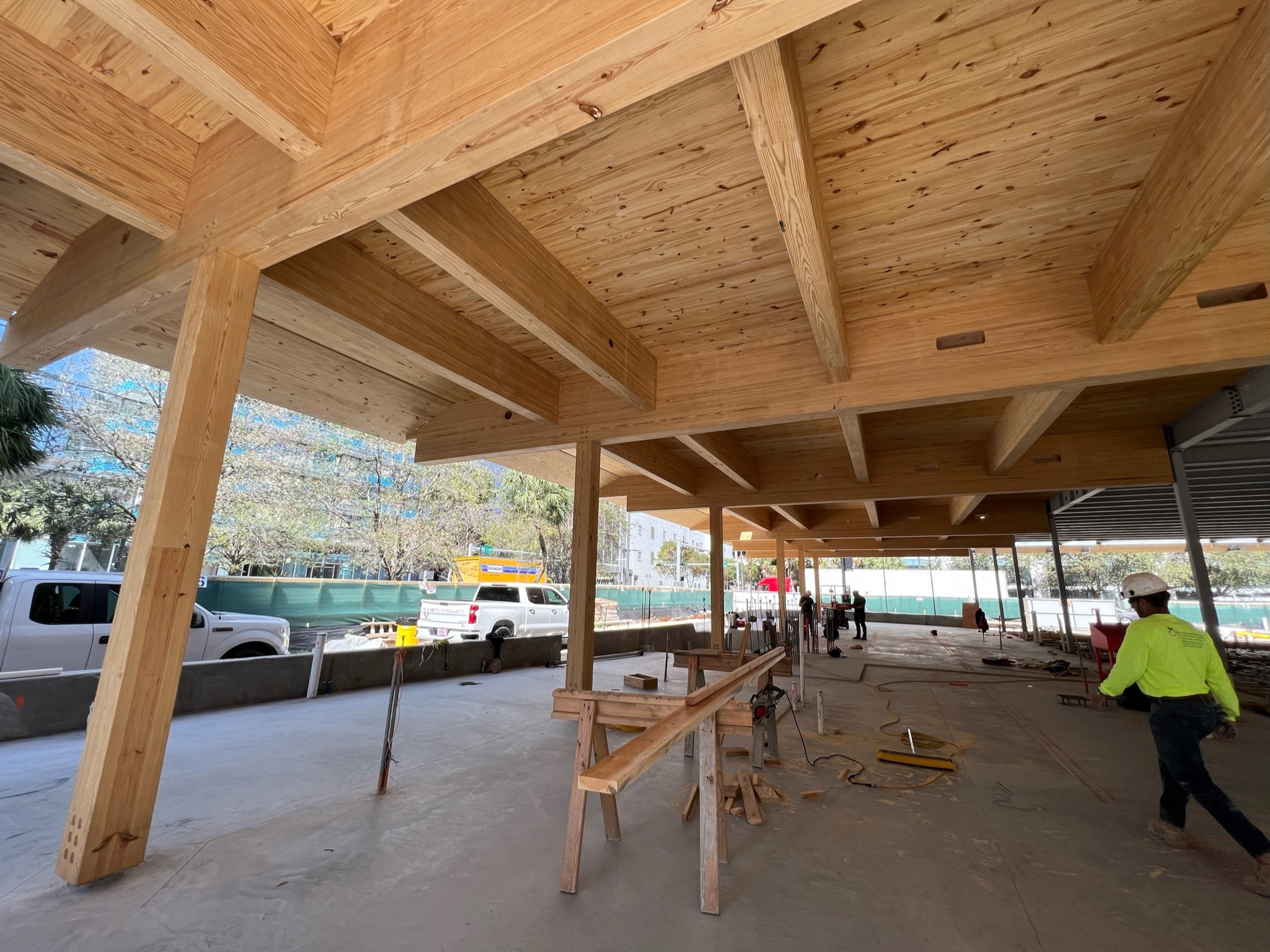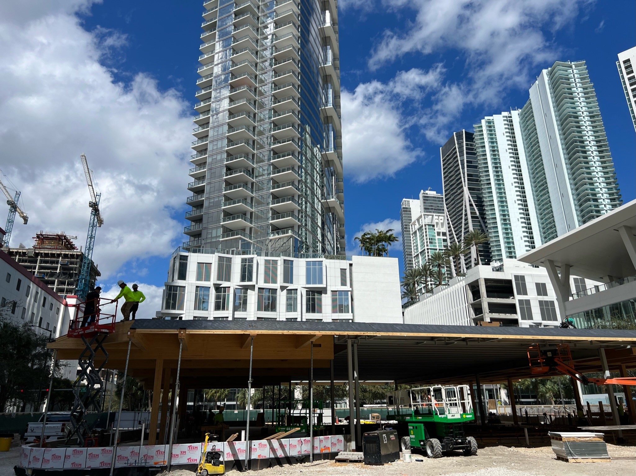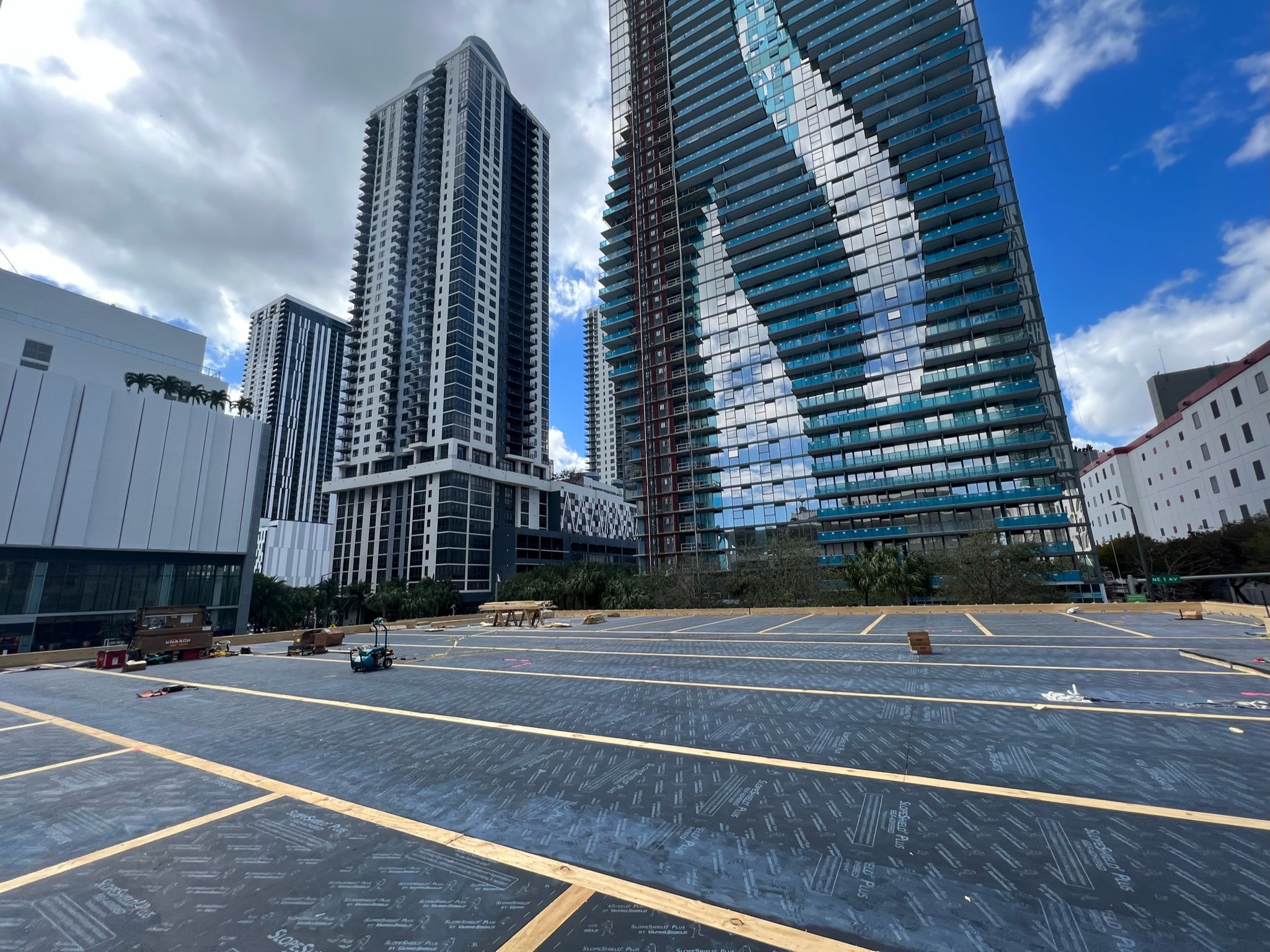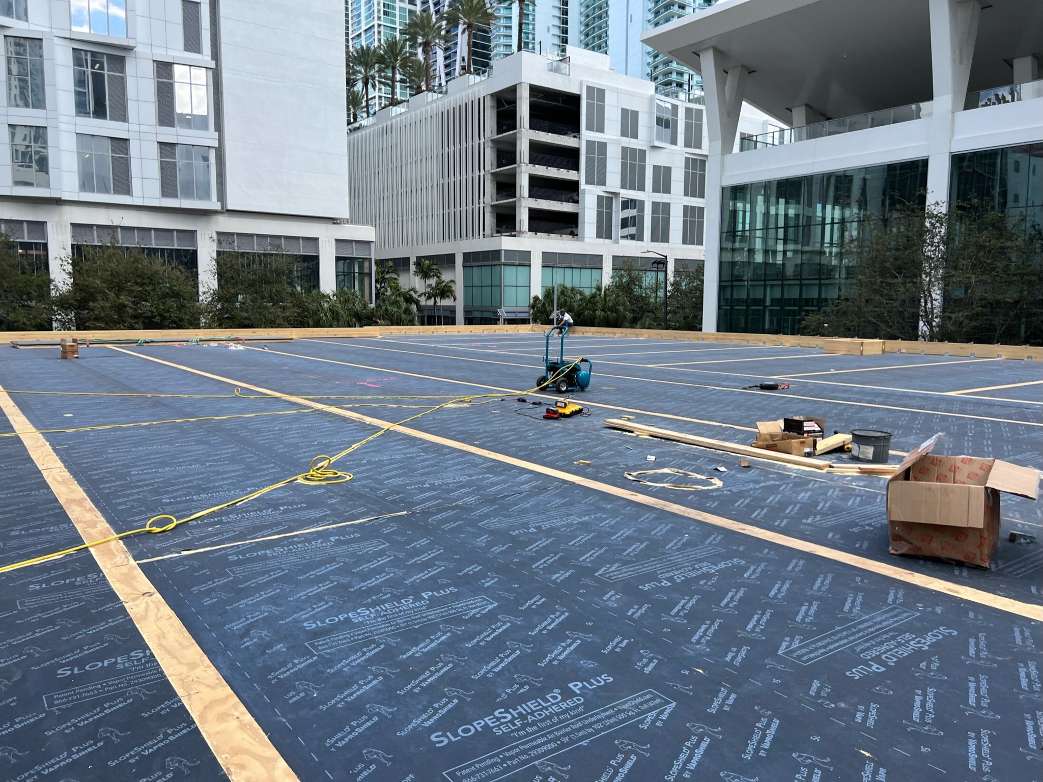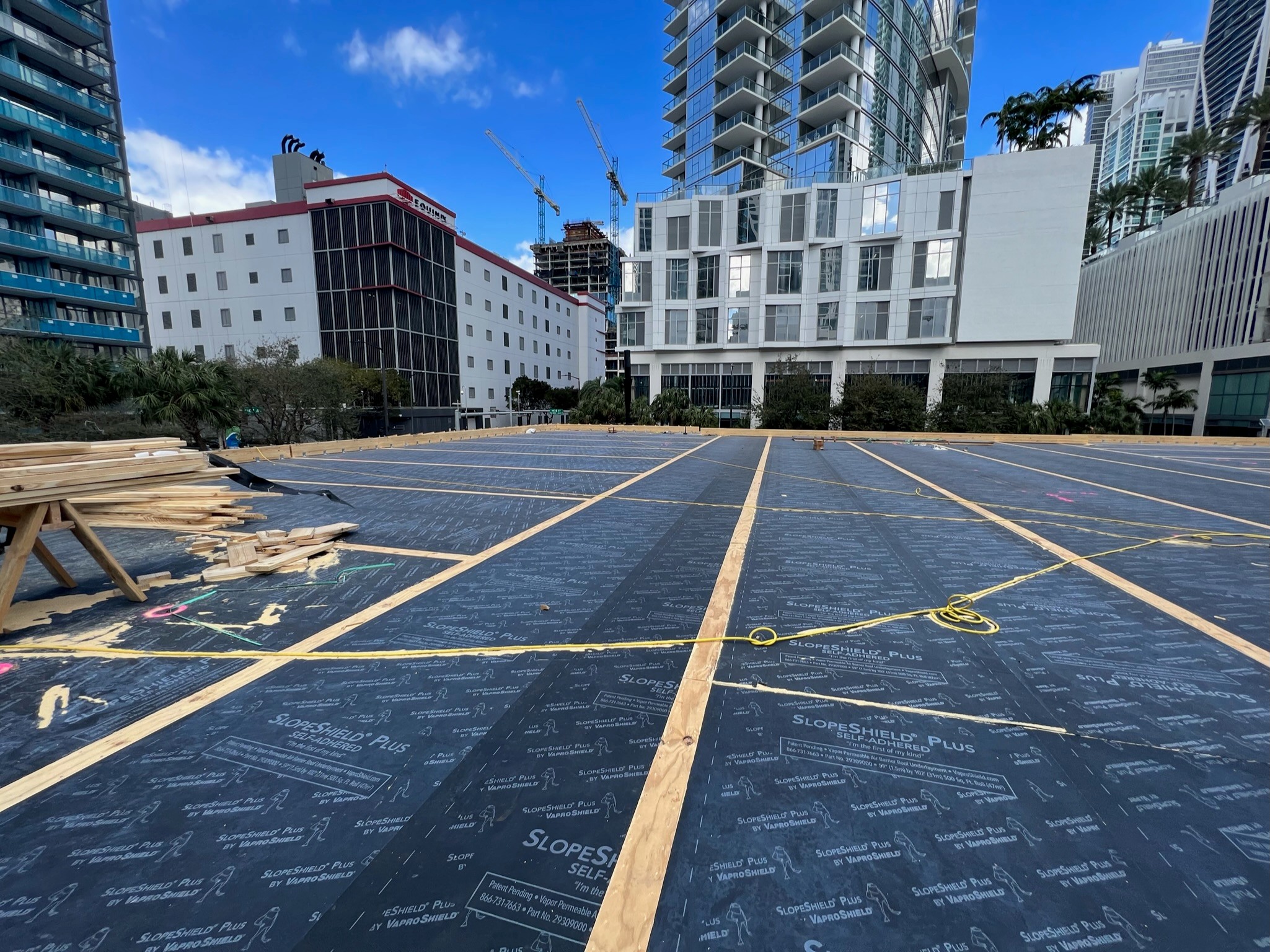 The Retail Store construction project in Miami, FL incorporated mass timber, a sustainable and environmentally friendly material. Over 20,000 sq.ft. of SlopeShield Plus SA, an air barrier vapor permeable membrane, was installed providing exceptional moisture management by blocking bulk water intrusion and concurrently drying mass timber through moisture vapor diffusion. Durable and tough to foot traffic and machinery, SlopeShield Plus SA can be installed on damp surfaces without the use of primer. It monolithically covers mass timber seams and splines and offers six months of UV and climate exposure, making it an ideal choice to meet the demands of todays scheduling challenges.