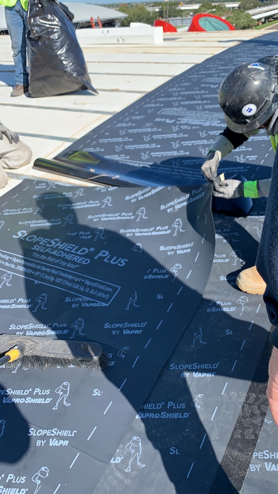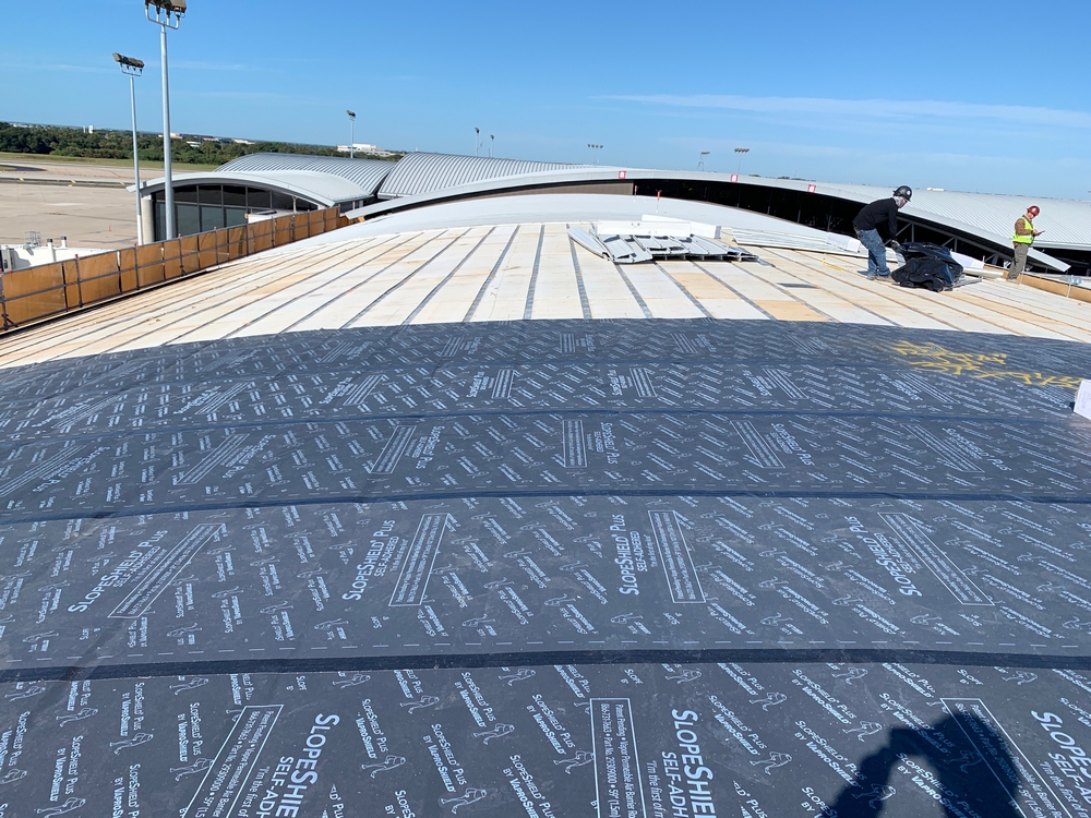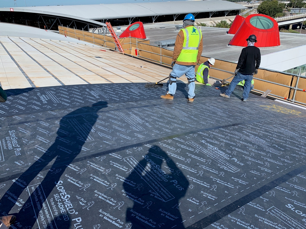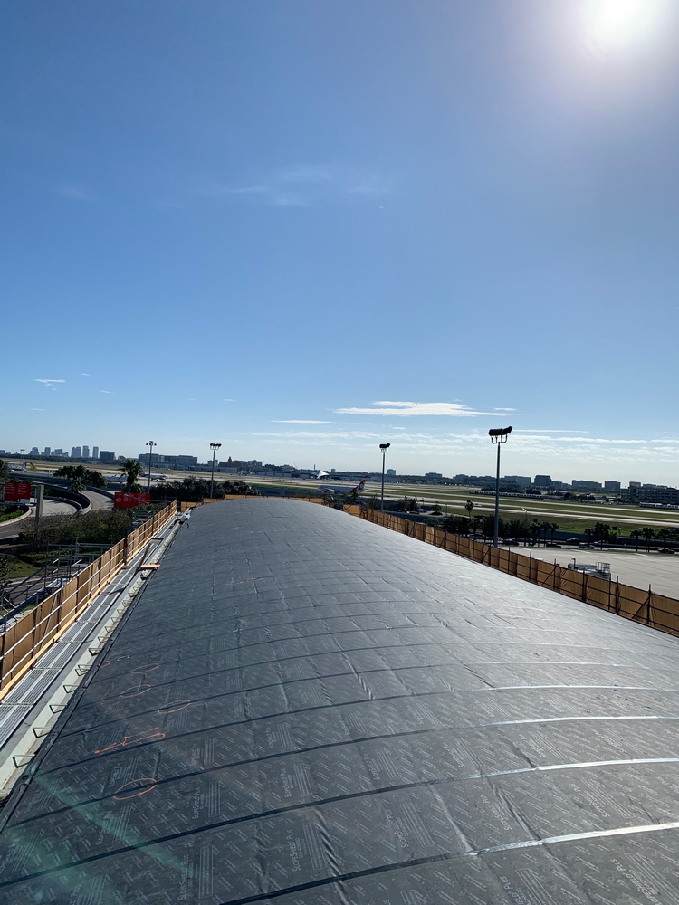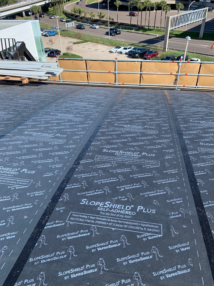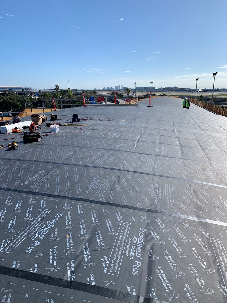 Over 120,000 sq. ft. of SlopeShield Plus SA was installed over existing roofing materials at the Tampa Airport, HCAA Project No. 6545 19 TPA Airside F Re-Roof. One of the key reasons the Architect chose SlopeShield Plus SA was its ability to breathe (due to its permeability), drying any moisture that would occur between the existing roofing material layers.
