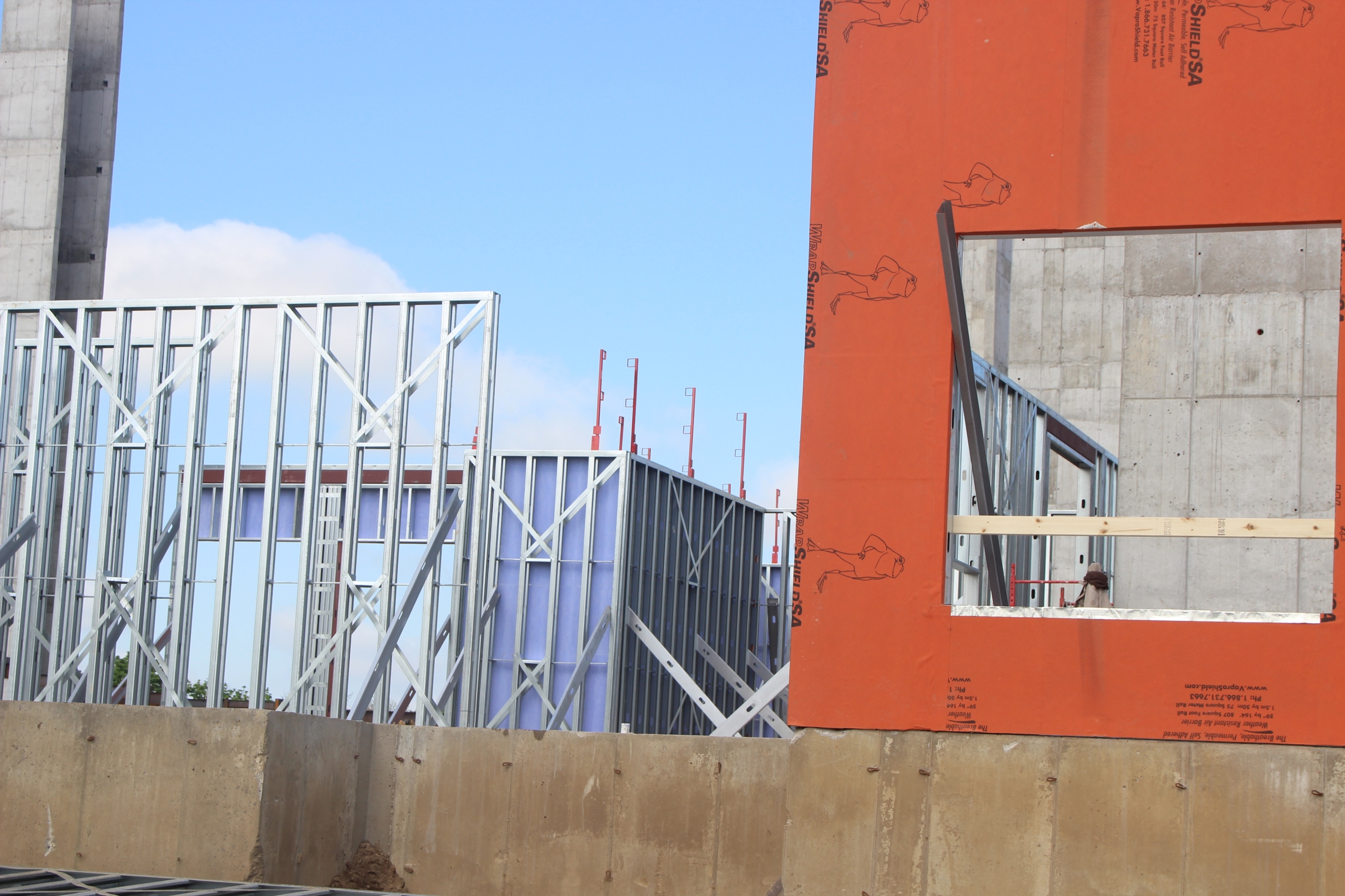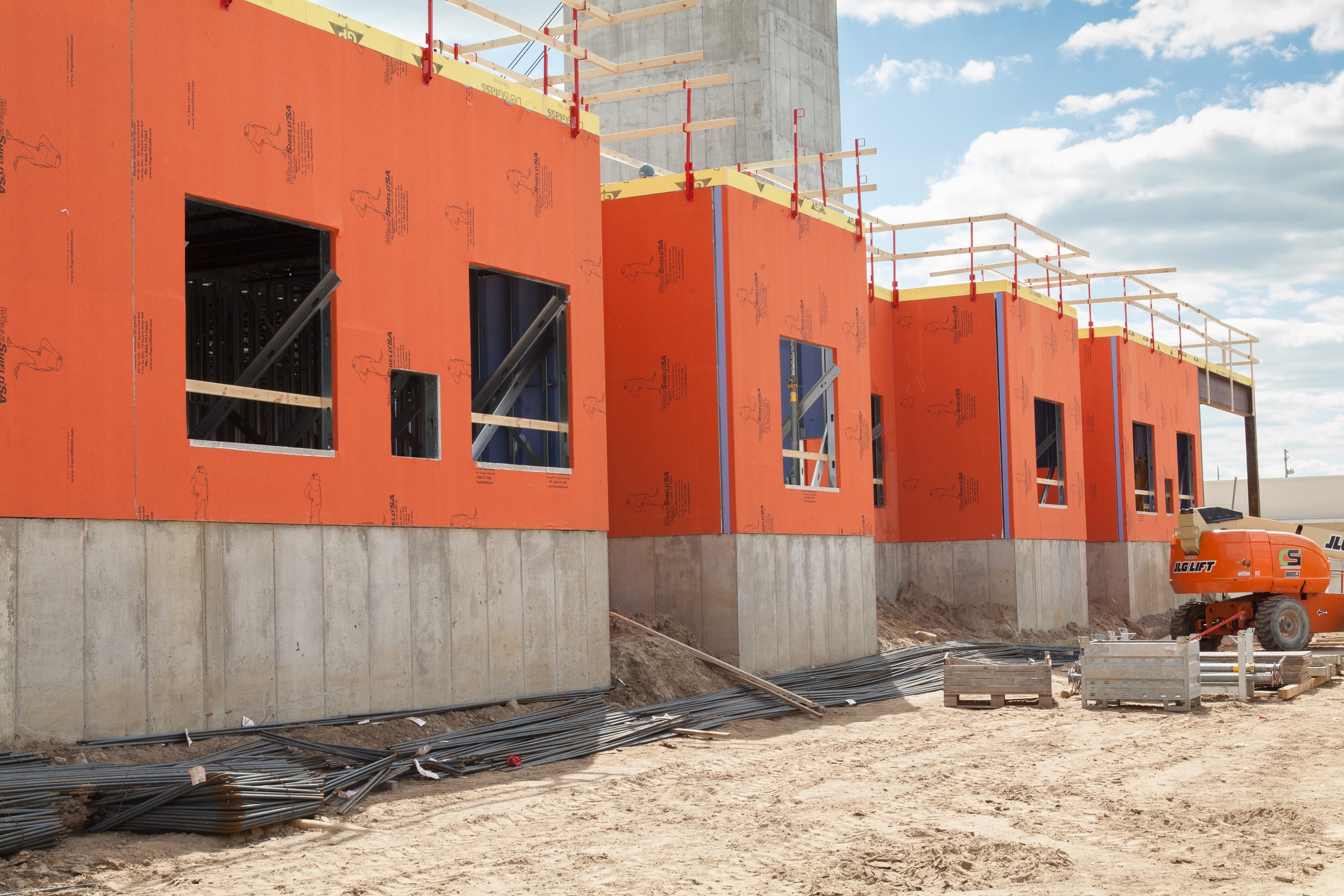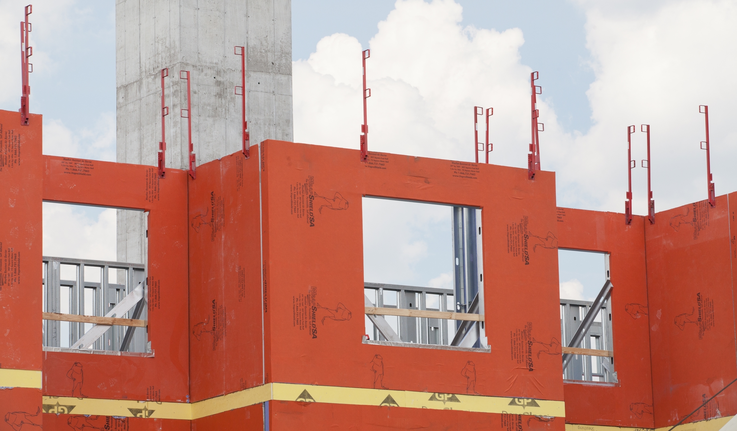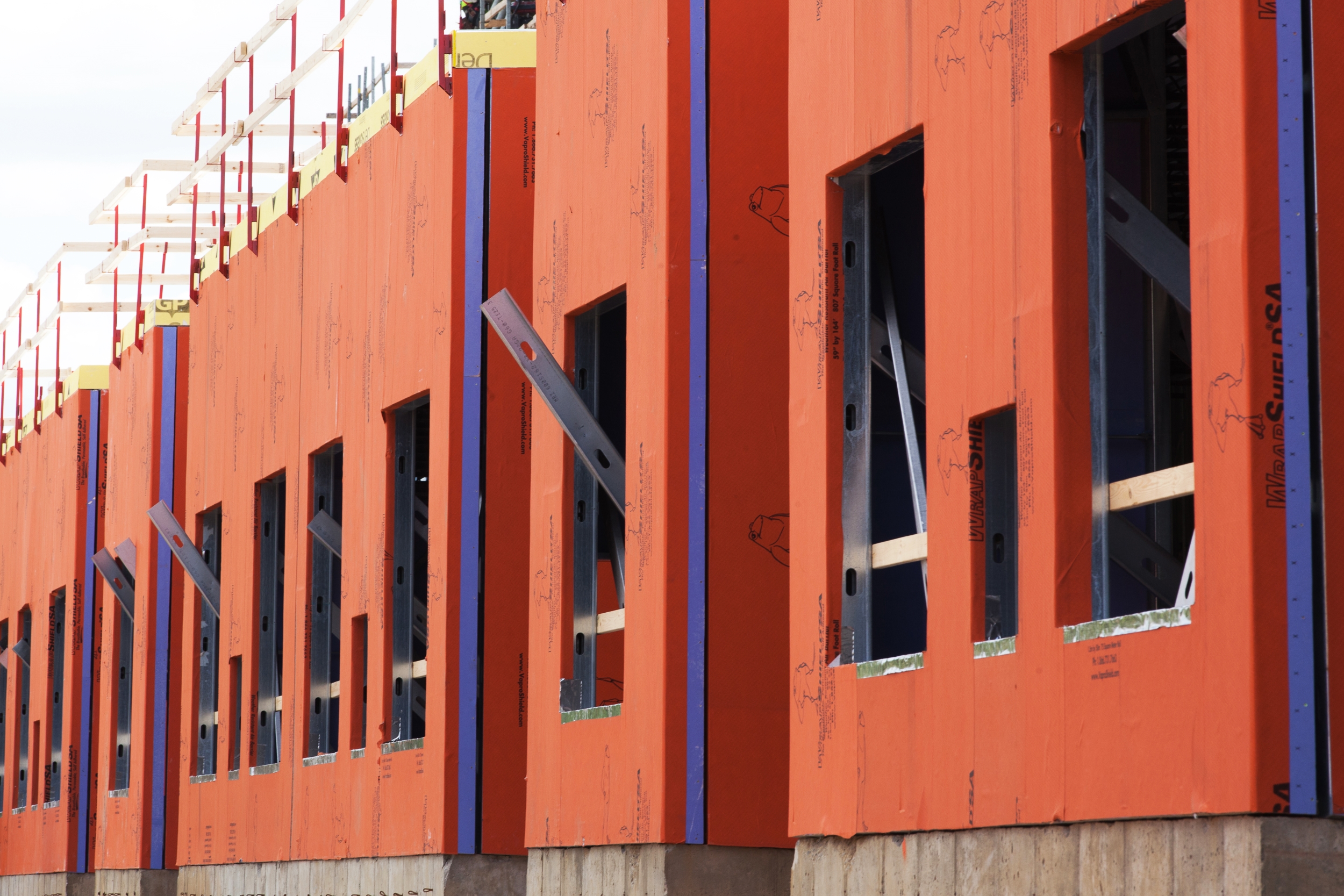 WrapShield SA Self-Adhered WRB/Air Barrier panels (orange) are being installed on the Skyvue Apartments in Lansing, MI.