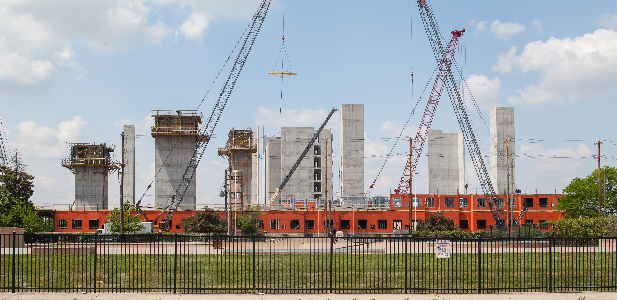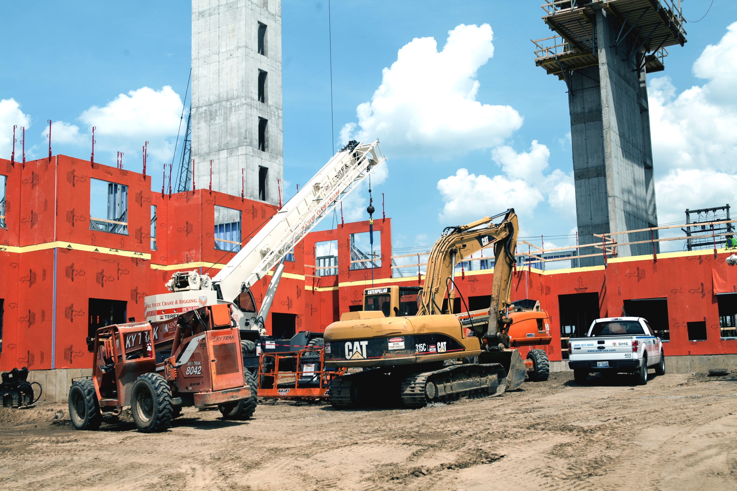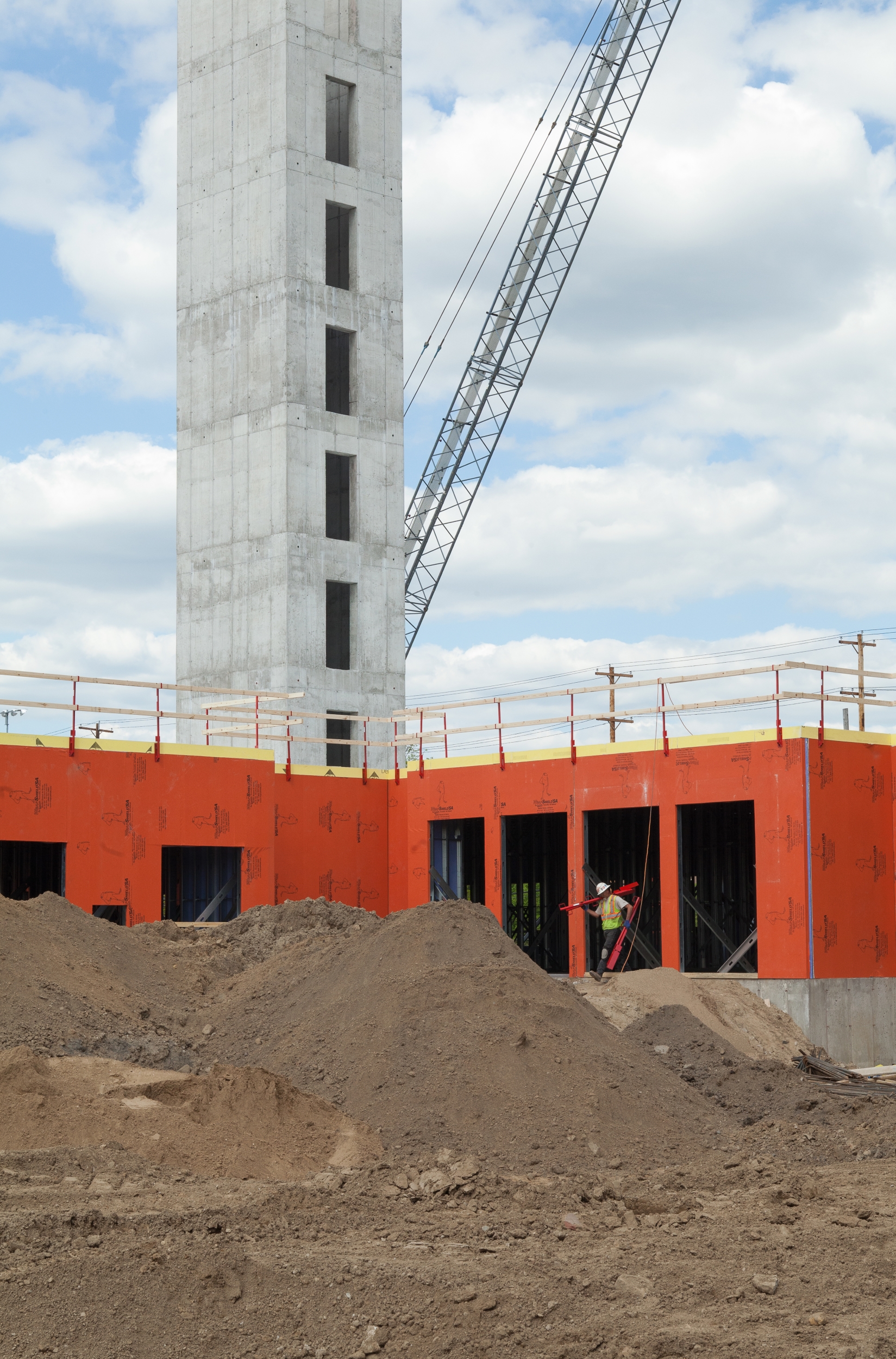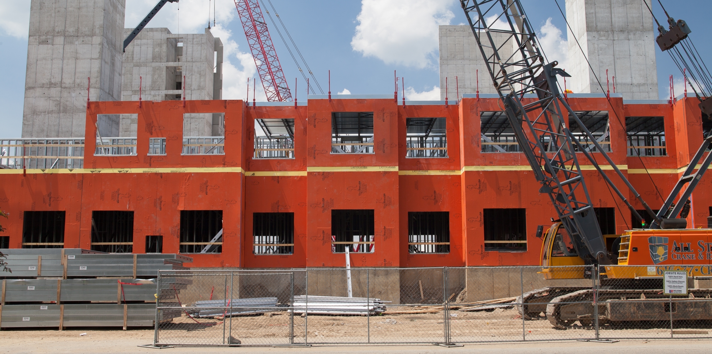 WrapShield SA Self-Adhered WRB/Air Barrier panels (orange) are being installed on the Skyvue Apartments in Lansing, MI.