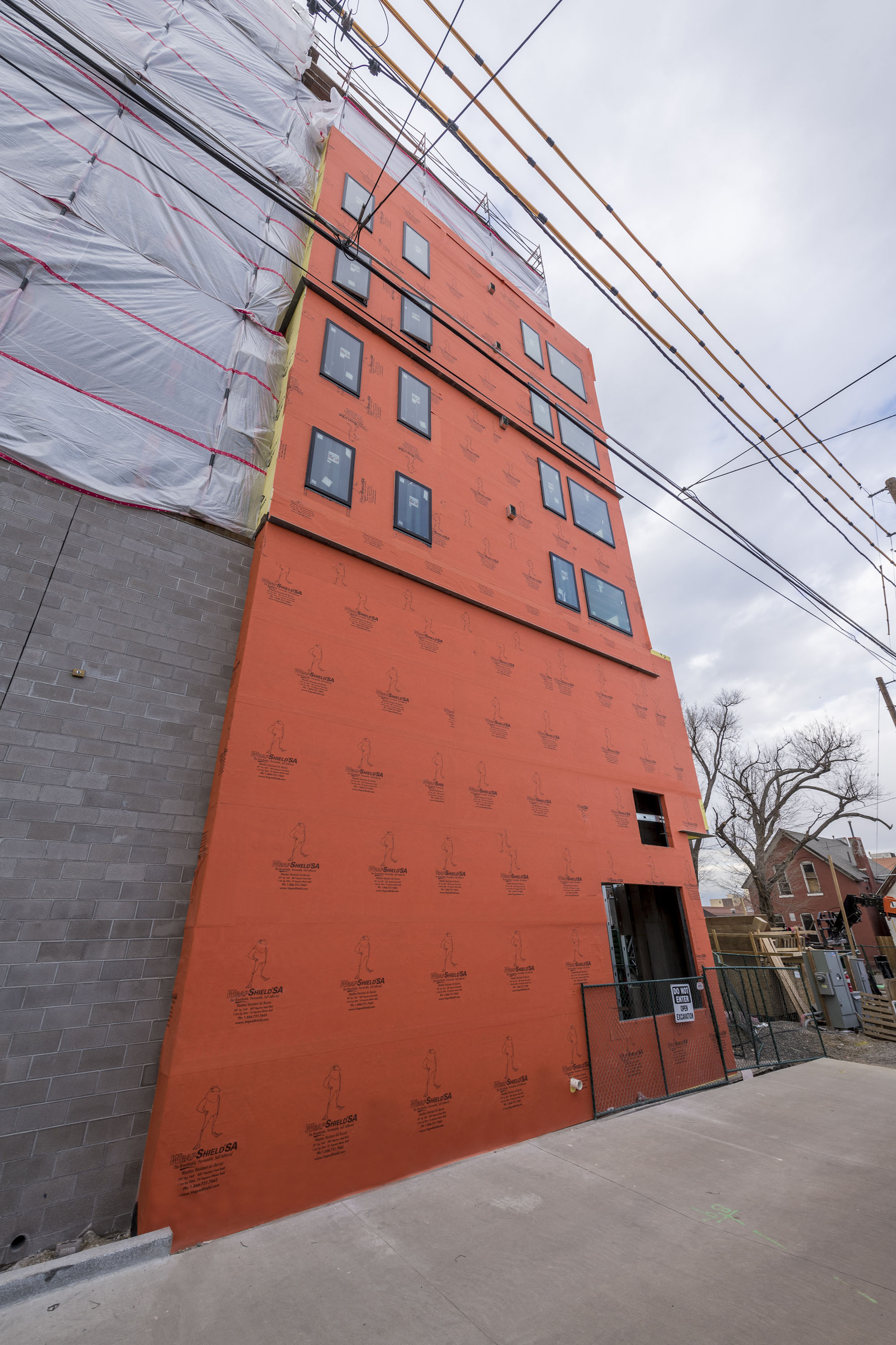 WrapShield SA Self-Adhered WRB/Air Barrier (orange) installed on The Lydian in Denver, Colorado.