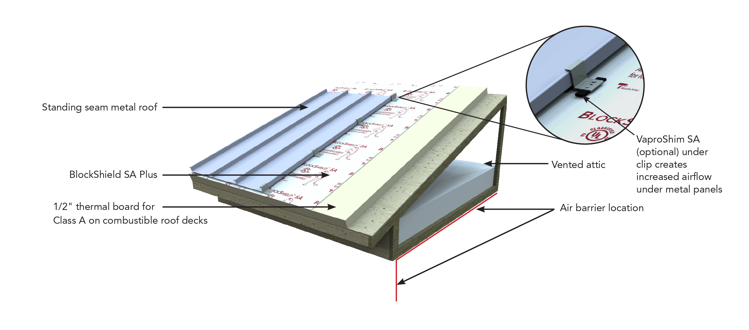 BlockShield SA Plus is typically installed on the warm side, below rigid foam insulation in a compact insulated roof deck.